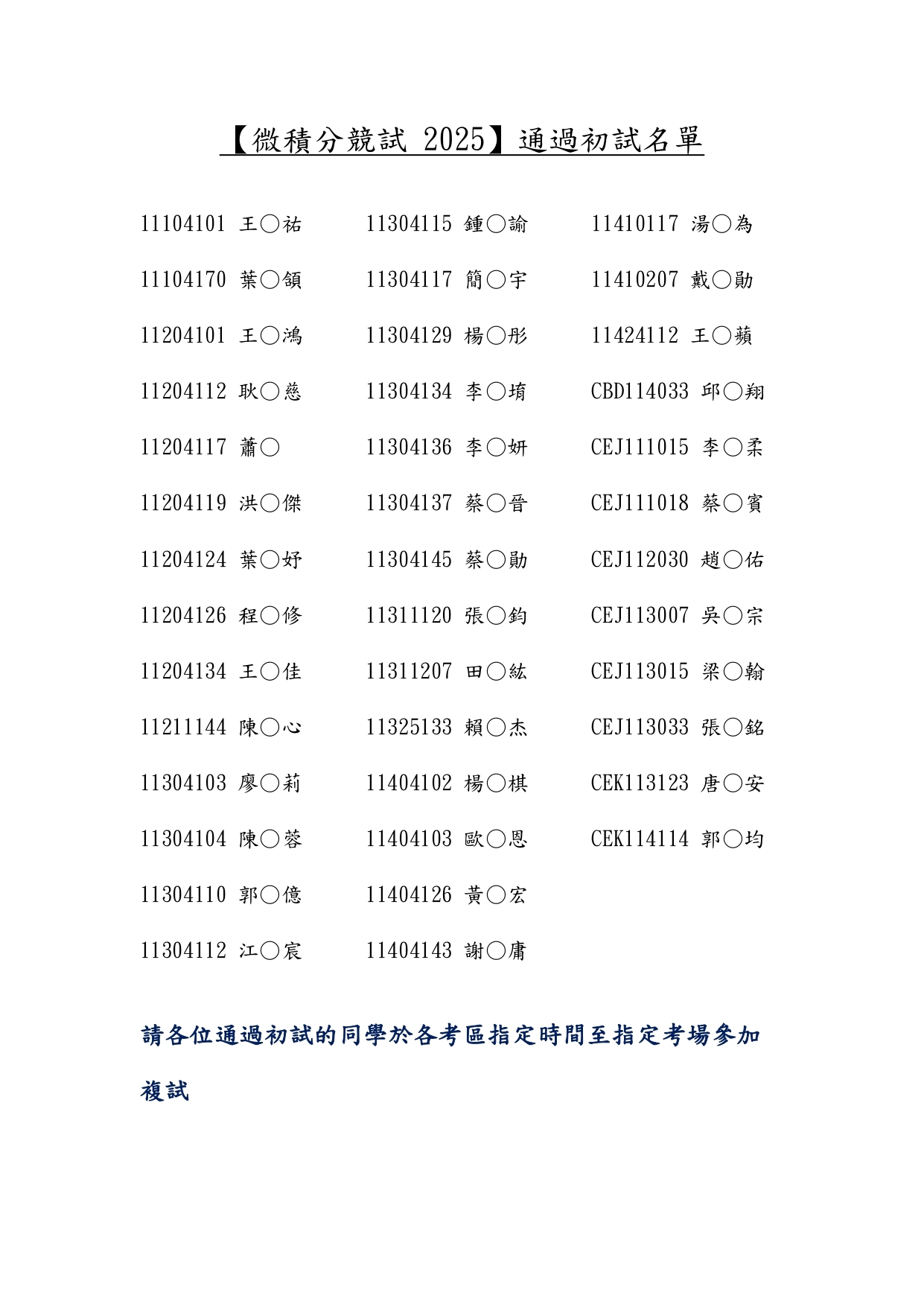 2025微積分競試 複試名單